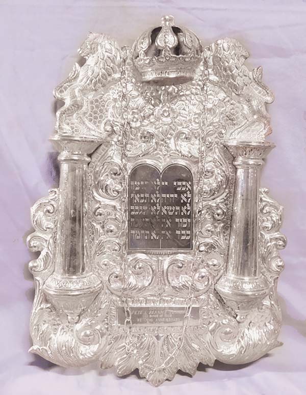 From Moshe Dayans eye patch and signed photo to a 100 ozt. Sterling silver Torah Crown, Barry S. Slosberg, a respected auctioneer in Philadelphia, has been selected to conduct a public auction on behalf of a relocating and downsizing synagogue and a prominent Philadelphia collector of Judaica. This large sale of 400-plus items will include eight Torah Crowns, 17 pairs of Rimonim (Torah finials), 25 Torah breastplates, numerous yads, spice towers, Kiddush cups, menorahs, Etrog boxes in Sterling silver by Bezalel, Pal Bel, 19th century Russia and more. Of the many mezuzahs there are two that stand out. A 19th century Italian silver one of unique form and style and a modern silver and crystal one by Yaakov Agam. To stay alert during services there are vintage groggers and shofars. The 12 tribes of Israel are featured in some of the 16 stained and leaded glass windows. Some antique items include a 34-inch bronze sculpture by Raphael Schwartz, a 19th century brass hanging oil lamp and a very rare 1870 Franco-Prussian War Kol Nidre scarf depicting soldiers on the battlefield in prayer. Tzedakah boxes include vintage lithographed tin and contemporary glass. Also included are 19th and 20th century books, paintings, and graphics. To assist those in prayer there are tefillin, tallit and antique prayer books and Haggadahs illustrated by Arthur Szyk, Saul Raskin and Jacob Steinhardt. If jewelry is a category of interest, there are gold and silver Chai and Mogen David necklaces, plus pins, medals and amulets. For any upcoming weddings, there are late 19th century elaborate figural repouss bride and grooms Sterling silver belt and buckles. Collectors of autographs and other ephemera will be delighted by the abundance of signed photos, correspondence and covers. David Ben Gurion, Chaim Weitzman, Golda Meir, Moshe Dayan, Yitzhak Rabin, Menachem Begin, Yitzhak Shamir, Shimon Peres, Abba Eban, Elie Wiesel and even Harry S. Truman are a sampling of the material in the sale. This auction will be held online on Wednesday, April 30, beginning at 10 a.m. To register or view the catalog, visit www.bssauction.com or Live Auctioneers, Invaluable, or AuctionZip. To request phone or absentee bids or to arrange a private viewing at 3455 Edgemont St., Philadelphia, call 215-425-7030. For other information, email info@bssauction.com.