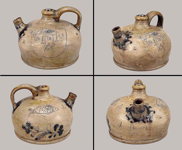 While most examples of American pottery from the 1700s and 1800s were manufactured with the intent that they would be used in the household as functional items, there were some made as presentation pieces. In some ways this personalized type of production emerged as a counterpoint to the more widely produced wares. These unique, handcrafted works sometimes focused on aesthetic appeal and skillful artistry, rather than a common utilitarian function. These types of objects were produced for family members, friends of potters, marriages, fraternal organizations and even religious purposes, etc. There are two such objects in particular that may not be widely known today, although they meet all the criteria for what might be considered a presentation object, one of which is owned by the National Museum of American History at the Smithsonian Institution in Washington, D.C., while the other is owned by the Scottish Rite Masonic Museum in Lexington, Mass. The object owned by the Smithsonian is a 19th-century cobalt decorated stoneware harvest jug adorned with the hand-inscribed name L. French. The form is also a type that was produced in France, which is typically called a cruche, a pottery jug or pitcher, often with a handle and spout, traditionally used for water, wine or oil, and popular for centuries among French country potters. The Smithsonian attributes the jug to Taunton, Bristol County, Mass., which was a popular region for red earthenware production in the 18th and 19th century, as well as stoneware in the 1800s. In fact, this industry was known to have produced some heavily decorated red earthenware jars for marriages within the areas Quaker sect or denomination in the broader group of the Religious Society of Friends in America in the late 18th and early 19th century. Two of the best-known examples of this type of production are displayed today at the Metropolitan Museum of Art in Manhattan, which were made for the marriage of George and Debby Purinton in 1809. The Quaker population in Bristol County was also very much part of the persecution in Salem, Mass., in the mid-1600s. It was decades later, when William Penn (1644-1710) founded the colony of Pennsylvania in 1682, as a safe haven for Quakers to live and practice their faith. Nonetheless, the brushed cobalt decorated tulip on the jug owned by the Smithsonian is a style of decoration known from the Ingalls family in Taunton, ca. 1830s to 1850s. Taunton has a rich history of stoneware production dating back to William Seaver (1743-1815) in the 1770s. Seaver is thought to have chosen the location because of the ease of moving clay by boat up the Taunton River. There were also some potters known to have worked in New Jersey who also found employment in Taunton. However, this is an unusual form of jug for Taunton. There is also no documented potter by the name of L. French working in Bristol County in the 1800s, yet there was a man named William E. French (1820-1866) with a peculiar job title in the Massachusetts State Census in Taunton in 1855. William French was born in Berkley, Bristol County, Mass., in 1820. He married Mary French (1823-1907) in Berkley on Oct. 5, 1845. The couple were living in Taunton when the 1850 United States Federal Census was taken, but French did not have an occupation listed. The 1855 Massachusetts State Census listed him as a laborer in Taunton, although no further information was cited about his profession. The 1865 Massachusetts State Census then lists him as living in Berkley working as a peddler, which is where he died in 1866. Interestingly, the couples second born daughter, Lucy M. French (1852-1907), was born in Taunton on June 15, 1852. The couple had at least seven children born between 1846 and 1863. The verbal history of this harvest jug says it was made by Benjamin Ingalls as a wedding present for L. French. The second presentation object owned by the Scottish Rite Masonic Museum is a stoneware harvest jug, inscribed, J. Romer / 1805, with Masonic symbols (all-seeing eye, sun, moon, columns, square and compasses, etc.), fish, fish hook(s) and stylized flowers. The jug may have been made in New York City, otherwise perhaps a Hudson River region potter. According to the museum, The potter who shaped and decorated this jug cut the owners name, J. Romer, and a date, 1805, under the spout. On the side of the vessel, he incised a whimsical picture of a Masonic apron into the clay, suggesting that the owner was a Freemason. John Romer, a member of Hiram Lodge Number 72 in Mount Pleasant, New York, may have called this jug his own. Furthermore, Captain John Romer (1764-1855) was born in Tarrytown, Westchester Landing, New York, on Nov. 10, 1764. He was the son of Captain Jacob (1714-1807) and Frena Romer (1725-1819). The family resided near the present Tarrytown Reservoir during the American Revolution, where Jacob and his three sons were involved with the war. John Romer was in a group of seven militia-men who captured British spy Major John Andre (1750-1780) in Tarrytown in 1780 and were instrumental in the success of the American Revolution. He later recounted his familys experiences during the Revolutionary War in an interview in 1845 with John MacLean Macdonald (1790-1863), who was a lawyer turned historian in both White Plains and New York City. The account of his handwritten interview is owned today in the New York Historical Society in Manhattan. A newspaper article published in The New York Evening Post on Nov. 27, 1897, titled, Forgotten Heroes: The Unmarked Graves of Revolutionary Patriots in Westchester County - Their Daring Deeds, recounts part of Romers life, There is one grave in this cemetery, however, which is cared for with tender solitude. It is that of John Romer, a militiaman of the Revolution, and a captain in the War of 1812, who died in 1855, at the advanced age of 92, in the house which his father-in-law, Cornelius Van Tassel, had erected on the foundations of the farmhouse