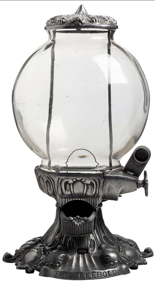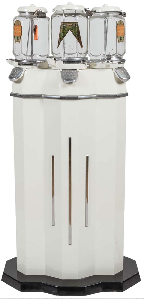A 716-lot coin-op and advertising sale was held on Aug. 28 at Potter & Potter Auctions. It had a 92 percent sell-through rate. All prices noted included the auction houses 20 percent buyers premium. The top lot was a working condition, McDonalds Speedee neon sign. Estimated at $5,000 to $7,000, it traded hands at $9,600. This ca. 1950s sign depicted the restaurant chains pre-Ronald McDonalds mascot Speedee, who was winking, balancing on one foot, and wearing a chefs hat and bow tie. The fixture measured 68 inches in diameter and included its original, undated City of Sacramento sign permit on one side. A late 19th-century Parlor Kinetoscope, was estimated at $1,000 to $1,500 and delivered $6,600. This crank handled, early optical viewer was patented by Thomas Edison in 1897 and retailed by the American Parlor Kinetoscope Co. of Washington, D.C. In a mahogany case and supplied with a loaded reel and four additional, it retained its original instructional slip, affixed to the interior of the case. A C.E. Leebolds The Leebold one-cent Gumball Vendor realized $4,800. This ca. 1917, Art Nouveau-styled machine was made from ornately cast aluminum and topped with a glass globe. It was sold with period padlocks and keys and marked with Berkeley Cal and the serial number 1000012 on its reverse. A Columbus Vending Co. five-cent Model 38 (Tri-More) vendor sold for $3,600. This machine was produced in 1939 and had three dispensers to vend gumballs, peanuts, and candy. Its globes were the number four octagonal design, which were mounted on a white, streamlined pedestal base that corresponded to the design of the machines. We were off to a strong start in this auction thanks to an impressive gumball machine and vending collection, but the second half of the sale saw enthusiastic bidding too, particularly for quality advertising and scarce chewing gum memorabilia, reported Joe Slabaugh, director of cataloging at Potter & Potter Auctions. For more information, visit www.potterauctions.com.