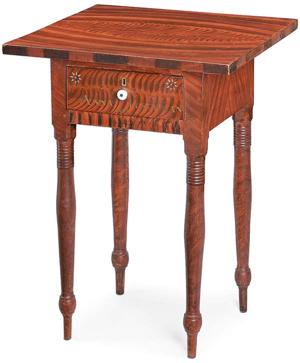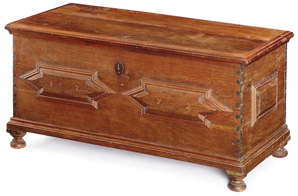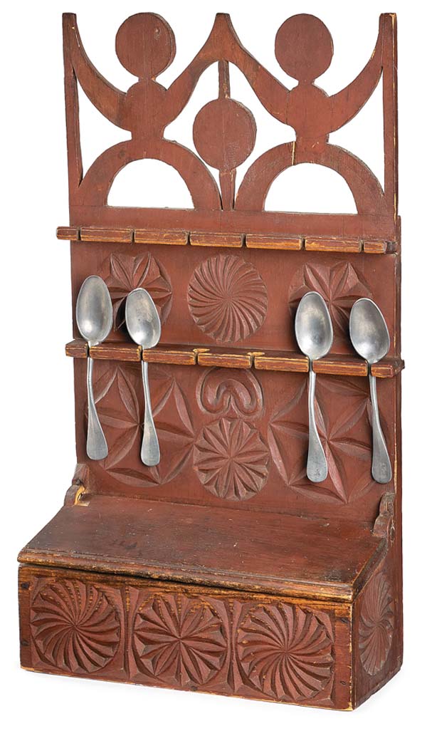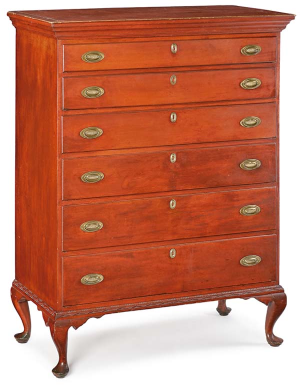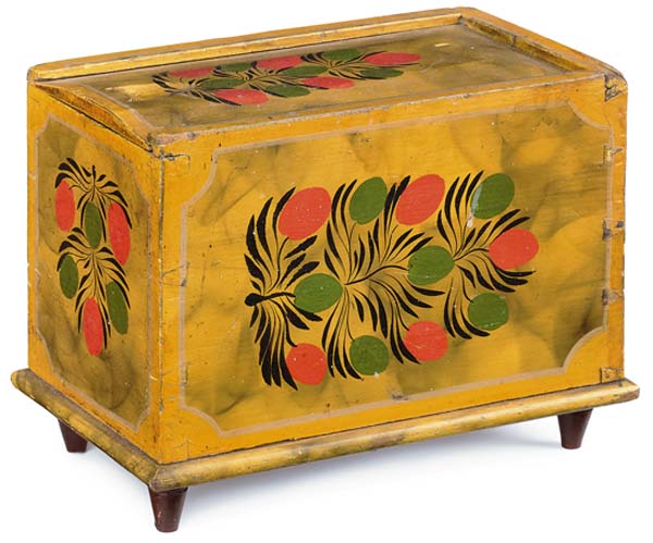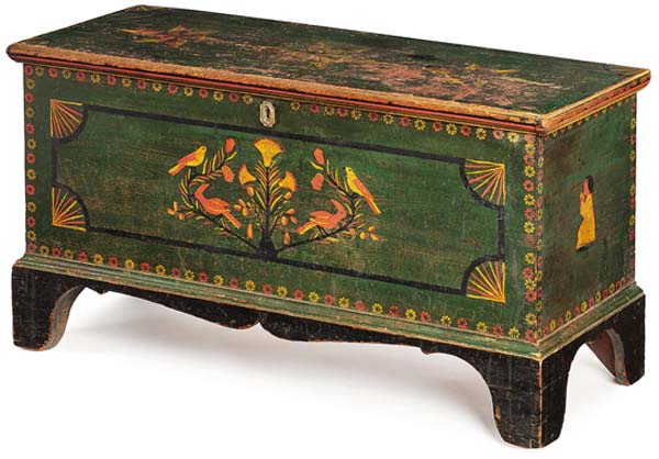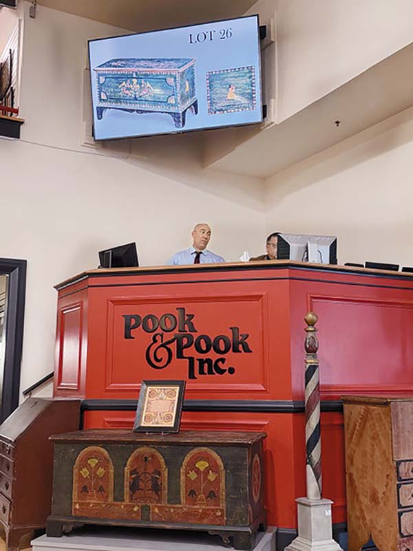 Pook & Pook of Downingtown, Pa., held a three-day blockbuster auction Jan. 14, 15, and 16. There were 990 lots, and 99 percent sold with a gross total, including the 27 percent buyers premium, of $3,560,800. The late Grant Griswold was an advanced collector in Virginia. He and his wife had gifted a number of items to museums, and the first 165 lots of day ones session belonged to Griswold. For the purpose of this brief recap, a concentration on the Griswold consignment is covered. Day two had great country antiques, early powder horns, fine art, firearms and more. Day three had early brass, woodenware, lighting, European decorative arts, fine silver, clocks, rugs, and of course, much more. Much of the Griswold holdings came through Connecticut dealer David Schorsch, who attended the sale and bought back a number of items. The early folk art portraits in the consignment performed well, showing depth in that market. Opening the sale and this fine grouping was a fine ca. 1800 New Hampshire stained maple tall chest, attributed to Samuel Dunlap (1752-1830) of Salisbury, with short cabriole legs resting on pad feet, remaining in its original red surface. A phone bidder bought it for $30,480. At the landmark Dr. and Mrs. Henry P. Deyerle sale held in Charlottesville, Va., in 1995, it sold for $112,500. Ode to those high flying 1990s, when the economy and market for antiques had no limits. The Griswold collection included rarity after rarity. The diminutive paint-decorated chest from the Mahantongo Valley brought $292,100 to a private collector in Massachusetts, who was a major buyer of items from this consignment. An odd size and surviving in excellent condition, the ca. 1840, lift-top chest measured 22 inches high and 39 inches long. Cataloged as from decent in the Lenker family of Leck Hill, Pa., the chest had been owned by folk art dealers David Wheatcroft and later David Schorsch. Its actually Leck Kill, where the piece descended, a community near Shamokin. This geographically and culturally isolated Pennsylvania German region is north of Harrisburg in an enclave of the Blue Mountains. A group of distinctive paint-decorated items, notably chests of drawers and blanket chests, were produced in this area in the first half of the 19th century. Early scholars of this material included Fred Weiser, Henry Reed, Mary Hammond-Sullivan, Don Yoder, and Tom Umholtz. In the 21st century, scholar Lisa Minardi has picked up the torch researching and publishing on the regions material culture. The buyer of the Mahantongo Valley chest was on the phone and is a New England collector who bought around 20 lots from the Griswold consignment totaling roughly $1,000,000. They would not be outbid on many of the early folk portraits. A very fine red ground Pennsylvania toleware coffeepot, attributed to the Oliver Filley shop of Philadelphia, retaining its original vibrant decoration, 10.5 inches high, sold for $40,640. It brought $55,000 on April 3, 2004, at the first Dorothy and Eugene Elgin sale held at Conestoga Auction Co. Another star was a pastel portrait in profile by Ruth Henshaw Bascom (American 1772-1848) of Cynthia Allen (b. 1823) of Fitzwilliam, N.H., signed verso and dated 1840, measures 19.25 by 15 (image size). Illustrated and exhibited at The Currier Gallery of Art at By Good Hands: New Hampshire Folk Art in 1989, the ex. David Schorsch portrait sold for $107,950. A folk art collector said the green dress enhanced this desirable folk portrait. An early Connecticut painted pine spoon rack, 18th century, with stylized pinwheel designs, retaining an early dark red surface, 27.25 inches high, published in Wallace Nutting Furniture Treasury, plate 4988, sold for $101,600 to the active collector in New England. A Lancaster County, Pa., fraktur with two pairs of owls and floral blossoms in each corner sold for $30,480 to Olde Hope Antiques bidding for a customer. We were delighted to get it, mentioned Ed Hild of Olde Hope. (Griswold consignment) was a fabulous collection and drew the attention it deserved. Also sold on day one, but from a different consignment (De Paulis), a Pennsylvania paint-decorated blanket chest with original decoration of three arched panels of potted tulips on a red ground sold for $1,651. It brought $9,350 at Conestoga Auction Companys Chris Machmer sale in 2003. It lacked lid and drawer locks, a repaired break to center drawer facing, and a couple repaired breaks to foot facings. A Joseph Moyer carved and painted Guinea Hen sold for $2,286. It went for $2,200 hammer price on June 20, 2020, at Pook & Pook. A Pennsylvania one-piece corner cupboard with heart and floral decoration on blue ground (cornice and moldings replaced) sold for $4,826. It also had once been over-painted and since cleaned down. The piece sold for $2,600 hammer price at the Ruth Bryson sale held by Pook & Pook in 2018. A Cowden & Wilcox stoneware lidded crock, small flakes to rim and lid, cobalt bird decoration, sold for $5,588, and an antique Louis Vuitton wardrobe trunk, $12,700. An important Philadelphia Chippendale mahogany pie crust table, the top replaced, the base, ca. 175 with carving attributed to the Garvan Carver. This unknown person is responsible for several masterpieces of Colonial Philadelphia furniture. It realized $139,700. A Peter Stretch (Philadelphia, 1670-1746) Queen Anne walnut tall case clock, with eight-day works, brass face signed by the maker, illustrated in Donald L. Fennimores Stretch: Americas First Family of Clockmakers, pages 230-231, no. 55, sarcophagus and feet replaced, one side waist molding replaced, sold for $60,960. For additional information, call Pook & Pook Inc. at 610-269-4040.