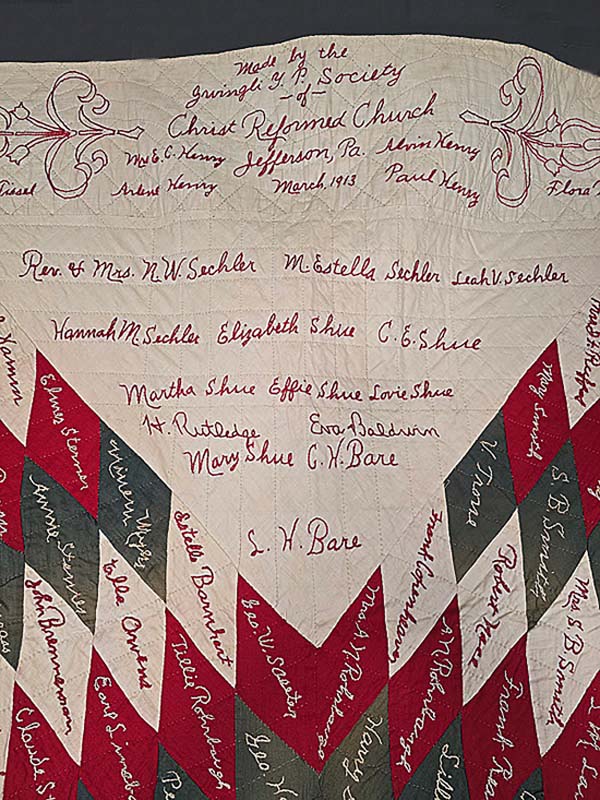 On Jan. 25, Dana Auctions of Princeton, N.J., held its Antique and Vintage Quilt & Textile Auction, featuring an exceptional quilt that captivated both collectors and historians. The quilt, a 1913 Pennsylvania Signature Quilt in the Star of Bethlehem pattern, sold for $6,150, including the buyers premium. This remarkable textile, crafted by the Zwingli YP Society of Christ Reformed Church in Jefferson, (York County) Pa., is a masterpiece of community history. The quilt features 700 embroidered name inscriptions, including the Rev. and Mrs. N.W. Sechler, the Henry family, and others such as Stauffer, Dill, Menges, Wehrly, Myers, and Hartman. It was consigned by the estate of Sharon Stark, a longtime antique textile dealer from Berks County, Pa., whose handwritten tag noted the name Henry Hartman, York Co., a name also found among the quilts inscriptions. A Quilts Journey Home Earlier in January, Dana Balsamo, owner of Dana Auctions, showcased the quilt during a presentation at the Pennsylvania Auctioneers Association (PAA) Conference in Harrisburg. The session focused on how to evaluate and market quilts for auction, and the quilts historical significance became a centerpiece of discussion. Several auctioneers in attendance recognized names on the quilt, sparking excitement when Charlie Wehrly of Wehrlys Auction House identified his grandparents names among the inscriptions. Moved by the quilts connection to their community, several auctioneers, including Scott Wehrly, Shawn Carbaugh, and Jamie Shearer, resolved to bring the quilt back to Jefferson, Pa. Carbaugh led a spirited fundraising effort over the next two weeks to raise the necessary funds for the purchase. His efforts paid off, and the quilt was ultimately acquired by the Codorus Valley Area Historical Society. Historical Connections and Community Impact Thomas Yingling, representing the historical society, drove to Princeton to collect the quilt following the auction. During his conversation with Balsamo, Yingling shared his findings about the quilts historical context. In 1912, the steeple of Christ Reformed Church was struck by lightning, necessitating a major reconstruction of the church faade and steeple in 1913. Yingling speculated that the quilt served as a fundraising project for this effort, with members of the community paying to have their names included. Balsamo suggested that prominent positions on the quilt, such as the center star or border, may have required larger donations. Notably, the church construction cost $5,000, equal to the winning hammer price bid. Yingling expressed his excitement about returning the quilt to Jefferson, where it will be periodically displayed for the public. The quilt, a testament to the craftsmanship and communal spirit of its creators, has found its way back to its origins, where it can once again connect people with their shared history. This story highlights the enduring legacy of antique quilts as cultural artifacts and symbols of community pride. For Dana Auctions, this sale represents more than just a transaction, its a chapter in preserving the rich stories that these textiles hold. The story also speaks to both the power of fundraising and networking. Balsamo is an AQS Certified Quilt Appraiser, and License Auctioneer. If you would like to contribute to the care and preservation of the quilt, visit the Codorus Valley Area Historical Society website at www.codorusvalley.org. To learn more about Dana Auctions, visit www.danaauctions.com.