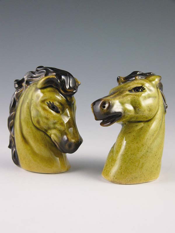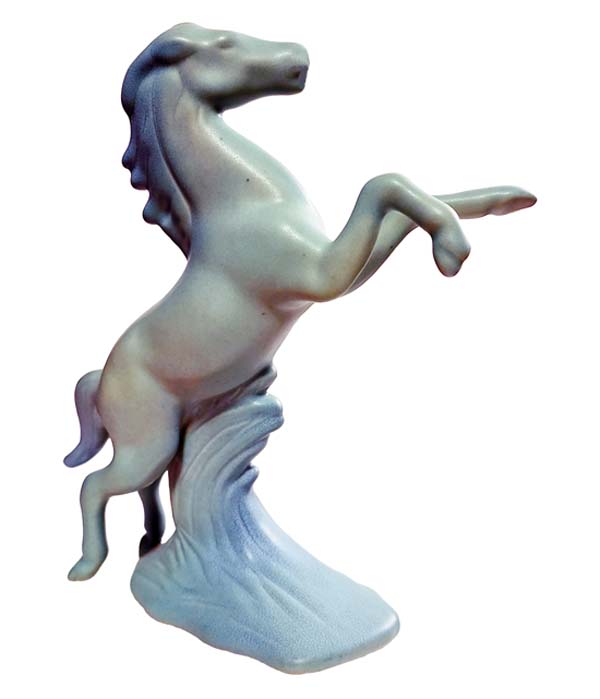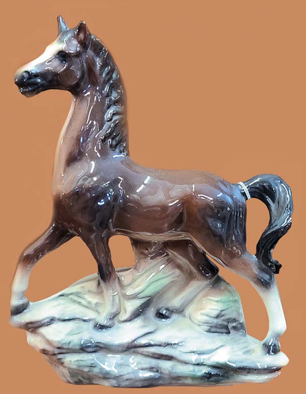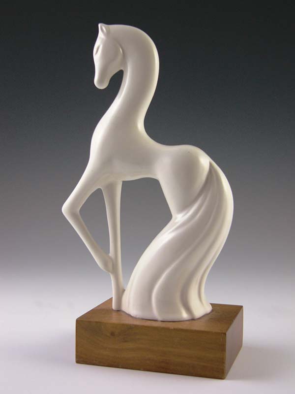 Horses are the stuff dreams are made of, such as Trigger, Black Beauty, Misty of Chincoteague, and Fury. Horses are strong. Theyre brave and loyal. Sometimes, theyre even funny, like Mr. Ed. To many folks, horses are considered members of the family, really large ones. With each pulsing hoofbeat, each tossing mane, were reminded anew of their magnificence. Horses first began trotting their way into the artistic landscape during prehistoric times; cave paintings of the animals date back about 17,000 years. Horse figurines came even earlier: miniatures carved of mammoth ivory emerged during the Paleolithic period (about 30,000 B.C.). More recently (recent = 2500 B.C.), figurines of horse-drawn chariots appeared in ancient Greek and Roman art. By the 14th-century Renaissance era, an entire stableful of horse art was let loose into the pasture, including an enormous (and uncompleted) equine monument by Leonardo da Vinci. As the centuries progressed, horses found themselves playing supporting roles in a series of visual stories: field scenes; transportation scenes; battle, hunting, and racing scenes; and plenty of sporting events. Finally, during the 18th and 19th centuries, good horse sense came into play, and horses themselves became artistic focal points. Using anatomical drawings as references, painters and sculptors were able to more realistically capture their bone structure, movement, and line. No more rocking horse art, with front and back legs fully extended. A better understanding of the variations in horse gaits meant artisans could successfully blend artistic license with reality. Now, when a horse sculpture seemed to come thundering toward you, it was hard to resist the urge to flinch. By the mid-20th century, horse figurines had made it across the finish line as decorative must-haves for the home. Nearly every individual craftsperson or firm joined the horse brigade to create figurals that would meet with public approval. Some managed an entire roundup. The prolific Betty Harrington, of Madisons Ceramic Arts Studio, went for artistically enhanced realism in such creations as her Horse Heads salt-and-peppers. However, she was equally at home with interpretations less bounded by reality, as in her futuristic Modern Colt, with its gaunt figure and attenuated limbs. Some ceramists, like Muriel Joseph George of Josef Originals, were comfortable closely mirroring real life (her horse figurals are actually more realistic than the human figurines she became famous for). Other designers of the 1940s and 50s viewed reality as just a starting gate. The horse basics were there, the mane, the tail, the pounding hooves, but once that was set, it was time to kick over the traces. Several achieved success by over-emphasizing defining characteristics. The glacially windswept locks on a horse by Howard Pierce are meant to be the mane attention-getter. Its hard, however, to imagine a horse with this ones oversize head and foreshortened body actually making a go of it in real life. With Roselanes Fantasy Horse, its the tail that takes center stage, imaginatively lush and swooping to the floor. And, Marc Bellaires abstract dappled dobbin is wonderful to look at it, but, in reality, hed have trouble balancing on those stubby little legs. Still, the image of what a horse is has become so deeply imbedded in our consciousness that we immediately recognize and accept each of these interpretations as valid. Even decked out with Lucite tails (Elzac), or with multitudes of golden bows (Copa de Oro), we know what were looking at: a horse is a horse, of course, of course. Horse figurines could be made of whatever material sparked the imagination, from the traditional (ceramic, glass, metal, chalk, or plastic) to the less likely (papier-mch, leather). And, while many were static, others did double duty as TV lamps/planters, salt-and-peppers, cigarette lighters, and even hors doeuvres servers. Fortunately, since many mid-century horse figurines were mass-produced, they remain readily available and affordable. With a bit of smart horse-trading, todays collectors can easily corral a herd of blue ribbon winners! Photo Associate: Hank Kuhlmann. All photos by Donald-Brian Johnson and Hank Kuhlmann. Donald-Brian Johnson is the co-author of numerous Schiffer books on design and collectibles, including Postwar Pop, a collection of his columns. Please address inquiries to: donaldbrian@msn.com.