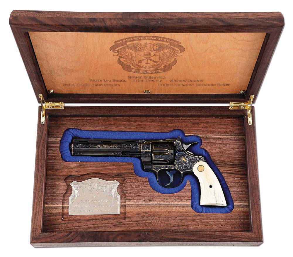 Premier examples of military, civilian and sporting firearms crossed the auction block on May 13 to 15 at Morphys flagship gallery in Denver, Pa., with aggressive bidding, especially on NFA weapons, pushing the grand total to $6,740,000. The top-selling lot was a factory-original Fabrique Nationale (Herstal) U.S. M240B machine gun, one of very few specimens of its type confirmed to be fully transferable to an individual owner. In near-mint condition, it retained its original tripod and even its original shipping box. Per its consignor, the gun had never been fired since leaving the factory. Its markings included U.S. M240 / 11825980 / MACHINE GUN 7.62MM on the left side of the receiver, followed by its serial number, contract number and National Stock Number. Prior to the auction, Morphy Auctions founder and president, Dan Morphy, pegged it as a superstar lot, calling it a tremendous example that would be all but impossible to upgrade. Morphys observation proved correct. In exceptionally high condition, the gun sold for a solid $467,400. Another big winner in the NFA category was a factory-original Heckler & Koch four-position-selector MP5SD3 machine gun, 9mm Luger caliber, with an HK MP5SD silencer. An IE proof code on top of the receiver indicated its year of manufacture to be 1984. It was further marked Made in W. Germany / HK Chantilly, Va. on the right side of the magazine well and HK MP5 SD on top of the receiver. Importantly, it conveyed to its new owner an official BATF letter identifying the gun and silencer as being unrestricted and fully transferable to individuals. This sought-after gun rocketed to $96,000. The revered Colt brand was well represented by arms whose rarity and provenance easily landed them in the auctions top 10. A treasure of the Civil War era, an outstanding cased set of Colts consisted of an 1860 fluted Army Revolver and an 1862 Police Revolver. The set was originally a factory presentation to Colonel Henry Craig, U.S. Army Chief of Ordnance. It conveyed to its new owner a copy of a 2019 factory letter confirming shipment on Feb. 25, 1861, to Major W.M.B. Hartley with the special notations: To Col. Craig, U.S.A. Commanding Ordnance Corps From Colts P.F.A. Mfg. Co. and Furnished with a shoulder stock, a powder flask, 60 cartridges, and 500 belt caps. According to firearms expert Greg Martin, this set was acquired directly from the Craig family. It sold for $116,850. Collectors stepped up to bid competitively on a special Colt .357 Magnum Python Double Action Revolver that showcased the collaborative work of three of todays finest active Colt Master Engravers: Mike Dubber, Barry Lee Hands, and Brian Powley. Proceeds specifically benefited the Firearms Engravers Guild of America (FEGA). With sumptuous engraving that included an almost-three-dimensional acanthus scroll against a finely executed punch-dot background, plus the phrase FEGA 2025 and a superb Rampant Colt image to the left side of the frame, the gun was also richly enhanced with gold borders and embellishments. Presented in a custom Colt case, it came with a FEGA letter signed by the principals who were involved, with an additional notation stating that the gun was manufactured in 1974. The formidable Python concluded its bidding run just shy of the high estimate, settling at $29,500. With a look that clearly reflected its Old West origins, an excellent Winchester Model 1866 Saddle Ring Carbine was a third model .44 Henry RF, manufactured circa 1872. It displayed stamped matching numbers in the stock channel and on the underside of butt plate and was evaluated as being in fine condition with the barrel and magazine tube retaining a great majority of their factory-applied blue. It made it to the top of its estimate range, selling for $28,800. Crafted by Ron Lake, a custom 18-karat gold and mother-of-pearl tail-lock knife featured a 2.5-inch mirror-polished ATS-34 blade marked LAKE and Au. In VG condition and housed in a plush zipper case, this knife boasted provenance from the collection of noted knife expert Frank Brownell. It attracted 24 bids before closing at $38,400. Prices quoted in this report are inclusive of buyers premium as outlined on Morphys website. For more information, visit www.morphyauctions.com. All images courtesy of Morphy Auctions.