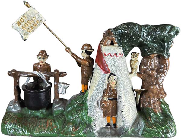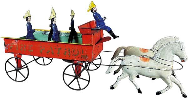 Arguably the most formidable alliance of high-level toy collections to appear in the marketplace in recent years, Bertoias 500-lot Signature Toy Auction confidently powered its way past the $2 million mark on March 15. The all-star lineup combined Part II of the renowned Curtis and Linda Smith Collection, Tony Cuffs European toys and trains, Japanese tin cars from the Ira Bernstein collection, and choice Lionel trains from the Bradley Kaplan Collection. After hammering the final lot, Bertoia Auctions president and principal auctioneer, Michael Bertoia, summarized the days highlights, The results showed what the toy-collecting hobby has always known, that great items bring great prices. Linda Smith and her late husband, Curt, were prominent in the toy-collecting fraternity and active members of the Antique Toy Collectors of America. They were known for acquiring pieces with illustrious provenance. The centerpiece was a late-19th-century Althof Bergmann Santa in a Goat Sleigh. This rarity is regarded as one of the finest pieces of American clockwork tin ever produced because of its impressive 20-inch size, bright colors, and endearing Christmas theme. The toy appears in the Barenholtz/McClintock book American Tin Toys as well as in The Toy Collector by Louis Hertz. When last seen at auction, it was hailed as the best of all known original examples. Against an estimate of $70,000-$140,000, the classic American bell toy realized $96,000. Also by Althof Bergmann, the only known complete, all-original example of a Fire Patrol Wagon displayed vivid handpainted colors and stenciled FIRE PATROL on its side. Large in scale at 16 inches long, the horse-drawn vehicle retained all five of its original firefighter figures in painted blue uniforms, yellow firemens hats and black boots. It blazed past its $6,000-$12,000 estimate to settle at $20,400. The Smith Collection was also the source of one of the finest of all George Brown toys: a clockwork version of the Civil War boat the USS Monitor. Made around 1870, roughly eight years after the original ironclad Monitor was launched, the historically-important toy offered by Bertoias was a sizable 14 inches long and had survived in an excellent state of preservation. The Monitor toys design significantly appears in the George Brown sketchbook. It sold well above its high estimate, for $34,800. The auction waters must have felt welcoming to fans of early ships and boats, as one antique craft after another set sail toward an above-estimate horizon. A gargantuan 1890s Jean Schoenner live-steam-powered ironclad ship, 34.5 inches long, reflected the style of the most advanced warships of the mid-to-late-19th century, with a large cannon on its bow and several guns on port and starboard. A top prize from the Tony Cuff Collection, the German behemoth surpassed pre-sale expectations, selling for $34,800. Ives toys put in a strong performance, with a scarce ca. 1870s double-oarsmen boat achieving $28,000 against an $8,000-$16,000 estimate. This well-documented piece is featured in both Blair Whittons reference book Clockwork Toys and the aforementioned American Antique Toys. Prior to the auction, there was a flurry of interest in a correct boxed set of four Bliss paper-over-wood battleships that pre-dated the Spanish-American War. The ships included the Cincinnati, the Iowa, the Maine, and a fourth vessel that was unmarked. The quartet came in its original cardboard box with a full pictorial label on the lid that was imprinted Toy Models of Uncle Sams Navy. In near-mint condition, it was chased to $14,400 against an estimate of $6,000-$9,000. Alongside the perhaps more-familiar production toys with a marine theme, wooden folk-art boats also grabbed their fair share of attention. A massive 53-inch-long clockwork paddle wheeler, the Robert E Lee, charmed bidders with the accuracy of its rigging, smokestacks, and railings, as well as the artistic excellence of its hand-painted details. Against an estimate of $2,000-$4,000, it cruised all the way to $18,000. The sale featured a small but select grouping of cast-iron mechanical banks, including a J & E Stevens Boy Scout bank. Extremely colorful with golden highlights to its grassy base and tepee, this popular and well-detailed banks design depicts a Boy Scout encampment. The auction example was in pristine condition, showing no touchups or repair. Importantly, the Scout figures arms were correct and authentic to the bank. With provenance from the Smith Collection, it conveyed to its new owner for $19,200 against an estimate of $6,000-$10,000. An outstanding Mason bank made by Shepard Hardware Co. was complete with its original wooden factory box marked ONE COMPLETE MASON TOY SAVINGS BANK. It took in $24,000, the highest price realized by any of the sales mechanical money boxes. A fleet of large, candy-colored 1950s/60s Japanese cars came from the collection of Broadway executive and industrial designer Ira Bernstein (1929-2023), who was hired by General Motors in 1953 as a stylist for Oldsmobile. Iras stellar Japanese cars were led by a Rock Valley tin rendition of a 1958 Chrysler New Yorker. A full 13 inches long with turquoise and pale lime-green motif, its tin seats were scrupulously lithographed to simulate red and white tufted upholstery. The pristine large-finned beauty even retained its original CH-19-58 framed license plate at its rear. Against a $1,200-$3,000 estimate, it swept the postwar toy competition, closing at $12,000. On the Lionel side of the train tracks, a big winner was the rare 1910 Knobby Roof baggage car stamped 1910, with red primer and three-rivet trucks (the underframe foundation). The 15.5 inch-long car from the Kaplan Collection rolled to a final bid of $11,400, nearly four times the high estimate. Of the many tempting European trains with provenance from Tony Cuff, a Bing (Germany) handpainted gauge 1 Sir Sam Fay 14-inch clockwork locomotive and tender fared best. In pristine condition, the