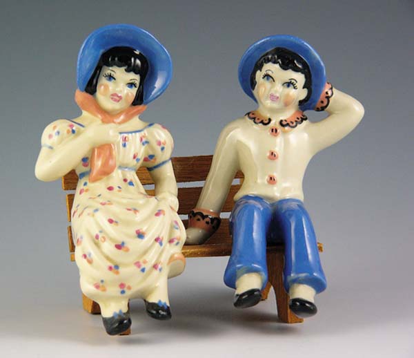 Captivating colonials, sleepy spaniels, cute cowpokes, musical moppets, and an appealing assortment of international visitors. What do they have in common? Well, theyre whats known as shelf-sitters. And theyre all sitting pretty, thanks to the efforts of Ceramic Arts Studio (CAS) in Madison, Wis. These ceramic figurines, most under $50 a pair in todays marketplace, perch on a shelf, ledge, window sill, planter, or whatever spot is handy. Their little legs (or, in the case of cats, dogs, and birds, their little paws or tails) dangle over the edge. The idea was a clever one, and Ceramic Arts Studio was just the place to bring it to life. Founded in 1940 by Reuben Sand and Lawrence Rabbitt, CAS was originally a pottery, an unsuccessful one. In later years, Sand sheepishly admitted the problem with the studios pots, bowls, and vases: They leaked. Things changed with the 1941 arrival of Betty Harrington. Although employed by the state of Wisconsin as a secretary, Harrington had previously-unrealized talent to burn. When a well was being dug at her home, she scooped up some of the excess clay and fashioned the figurine of a kneeling girl. Wanting to preserve the piece by having it fired, Harrington remembered passing a ramshackle shop, Ceramic Arts Studio, on her way to work. She stopped by and was told by a disinterested potter that the studio didnt do custom firing. A discouraged Betty left. A keen-eyed Reuben Sand met her on the way out. Sand had been searching for a product to replace those leaky pots. One look at the figurine Betty held told him he may have latched on to the solution. I said of course we would fire the figure and glaze it, and if she wanted, we would fire other items that she might wish to bring in. Soon, Ceramic Arts Studio was transformed. Decorators and kiln operators replaced the potters, casting, painting, and firing winsome ceramic figurines as fast as Betty Harrington could design and mold them. The days of porous pottery pots were left behind. And, although California Pottery became a byword for the post-WWII production of decorative ceramics, it was Madisons little studio that could that led the pack. During its heyday, Ceramic Arts Studio was the nations top producer of ceramic figurines, turning out over 500,000 annually until closing in 1955. Always on the lookout for ways to increase revenue, Reuben Sand suggested figurines that did double duty: salt-and-peppers, bells, banks, candleholders, and, of course, those shelf-sitters. According to Sand, they were an immediate hit. I made it a point to go out to gift shops around the country to see what they wanted and then would bring back those suggestions. The best idea I got came early, and that was for shelf-sitters. That one came from a lady up in Michigan. She said that her grandmother had something she never saw on the market, two little figurines that were sitting over a shelf. That hit me! Those shelf-sitters made us a lot of money. (No doubt, replacement figurines also added to the coffers: without the addition of a little tacky wax on their bases, CAS shelf-sitters have a tendency to topple). Betty Harrington took Sands basic idea and ran with it. As she recalled, When you visualize something, and you kind of feel its you, almost, you have a fairly definite idea of what you want to do with a figure, and if that doesnt work, you can ad lib while youre working on it! When it came to shelf-sitters, Harringtons eagerness to experiment meant that CAS Ballet Dancers were soon jockeying for shelf space with the Bali Boy & Girl, and Persian Cats were rubbing elbows with Pete & Polly Parrot. Buyers sat up and took notice, and ever since, collectors have been sitting ducks for the irresistible appeal of Ceramic Arts Studio shelf-sitters. The Wisconsin Pottery Association (WPA) will hold its annual Show & Sale on Saturday, Aug. 23, from 9 a.m. to 3 p.m., at the Alliant Energy Center, Madison, Wis. As always, plenty of pieces by the hometown studio, Ceramic Arts, will be available for purchase. Photo Associate: Hank Kuhlmann. Caption quotations are from the original Ceramic Arts Studio catalogs. Donald-Brian Johnson is the co-author of numerous Schiffer books on design and collectibles, including Ceramic Arts Studio: The Legacy of Betty Harrington. Please address inquiries to donaldbrian@msn.com.