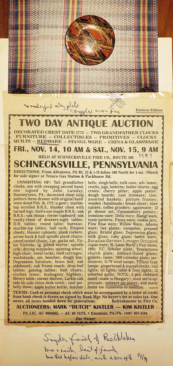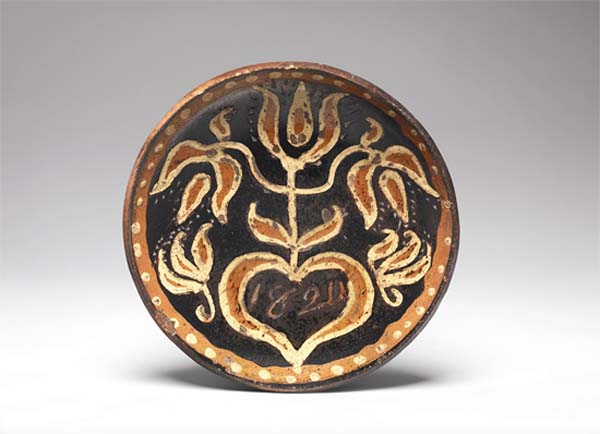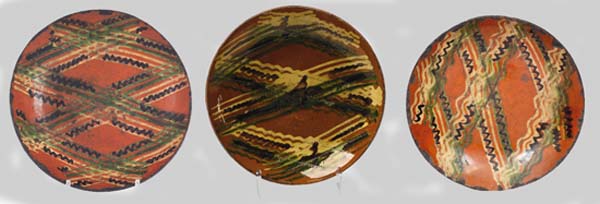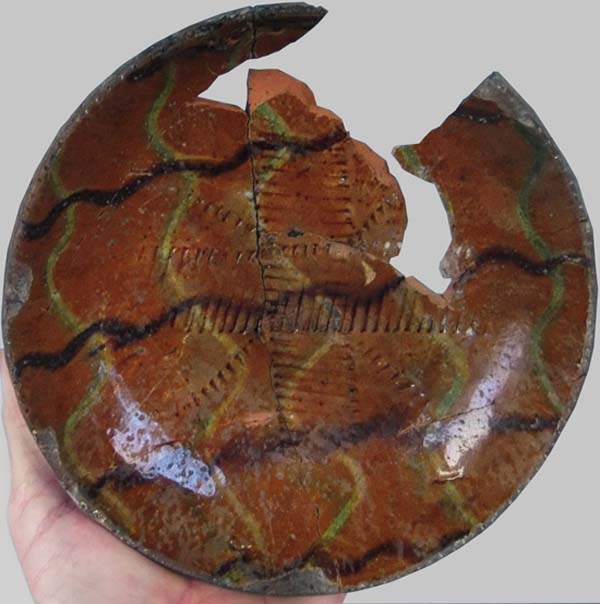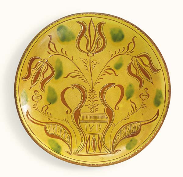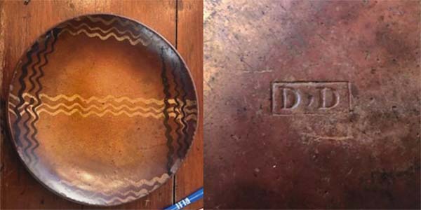 One of the more visually pleasing types of 19th-century red earthenware from the American Northeast is a style of plate adorned with three colors of crossing slip decoration that was manufactured in southeastern Pennsylvania. These plates are also adorned with a coggled wheel that resulted in a repetitive line decoration. But there are only a small group of these plates that are known to exist today. They were drape molded, and some (most) are also marked on the back with a stamped number. One of the best examples was found decades ago in Bucks County, Pa., and is currently privately owned in a prominent Pennsylvania collection, which was the subject of a feature story written by Johanna McBrien for the Spring 2013 issue of Antiques & Fine Art Magazine, titled, Kindred Spirits. Another example was previously owned by Lester Breininger (1935-2011), which he purchased at a sale in Schnecksville, Lehigh County, Pa., in 1999. His note fromthesale bill reads, Snyder family of Bethlehem bro & sister last of family bro died before sale, sister soon after 1/3/99. Ohio potter Greg Shooner noted, Lester Breinenger always thought of these as Berks County, Pa. Probably comparing the 5/6 divided slip cup with other pieces attributed to Daniel Dry of Dryville, Pa. The white, copper and manganese slips applied with this cup have similar, if not identical gaps, and were applied in tulip patterns as well as criss-cross and plaid motifs.If these are not Berks County, I would suggest that they were at the very least journeyman work and closely related. An artifact that could be related to these plates wasrecovered a few years ago by Tom Kennedy Jansen from an 1860s archaeological context in southern New Jersey. The 19th-century ownership of this plate is unknown, but it appears to be related, decorated with a similar crossing three-color slip decoration, as well as impressed with repetitive lines from a coggle wheel. But the back of this plate is not marked with a number. Pottery production began in Stony Point, Berks County, Pa., in the 18th century with the Melcher (or Melcheor) family. The rural community is located about 55 miles northwest of Philadelphia. However, Stony Point became Dryville on May 3, 1853, when Dr. Benjamin E. Dry (1819-1907) was appointed the first postmaster and the Dryville Post Office was established. The name change was done to honor Dr. Dry, although he was also a potter, and the son of John Dry (1785-1870) (or Drey), a German who had acquired the Melcher family pottery in 1804. It is unclear where John learned how to become a potter, although he may have previously worked for the Melcher family. But after Benjamin worked for his father, he moved to New Berlin, Union County, Pa., and continued to work in the pottery business with his uncle Jacon Egolf, before returning to Berks County to become a school-teacher, a justice of the peace, and finally, the postmaster. John was the son of Paul Dry Junior (1756-1818) and Elizabeth Ettinger Dry (born ca. 1760), both of whom were born in Berks Couty. John married SalomeEgolfDry (1786-1863). The couple had five sons and six daughters, and at least two of the sons became potters; Benjamin and Daniel Dry (1811-72). Daniel then married Hannah Heffner Dry (1816-1900) on June 19, 1836, and the couple had seven children, four sons and three daughters. One of their sons, Nathaniel Dry (1842-64) became a third-generation potter. It is likely that other family members were involved in the pottery business during the ca. 1806 to 1880 period. Nonetheless, the Stony Point/Dryville Pottery is best known today for various sized one, two and three-colored slip decorated red earthenware plates, although the family manufactured a wide selection of forms, ranging from utilitarian shapes to whimsical objects and even molded pipes. In fact, some of John Drys early production seems to include sgraffito-decorated wares, such as one plate that is adorned with tulips and an urn, dated 1819 and inscribed in pencil on the back, Madeby John Dry /Dry Pottery/Stony Point Pottery/Dryville/Lydia /David Hess / Frederick / Bought by / C. Nippon / Nov.16 1819. He also appears to have made whimsical figures, including bird whistles. There is also a ca. 1820s sgraffito-decorated red earthenware plate in the collection of the Metropolitan Museum of Art in New York City that is said to have been made by Daniel Dry, while working at his fathers business; the back of the plate is inscribed Daniel, while he is also known to have marked some of his production with a stamped D D. Furthermore, Pennsylvania historian Guy Reinert, who wrote about Pennsylvania German culture in the early 20th century, discussed this topic. There is a file of his work at the Winterthur Museum in Delaware, which includes his photos of the Pennsylvania potters, Jacob Medinger (1856-1932) and Isaac (1872-1950) and Thomas Stahl (1863-1942). Reinert also wrote an article for the January 1937 issue of Historical Review of Berks County, titled, History of the Pennsylvania German Potters of Berks County. It reads, The Drys marketed their earthenwares successfully throughout Berks County, transporting finished loads by wagon to various local markets. Surviving records from the operation indicate the range of goods offered and their prices. A number of simple plates in various sizes, decorated with a single, abstract two- or three-color slip-trailed tulip, survive and are attributed to their manufactory. They are also thought to have produced a range of more ornate plates with customized inscriptions and commemorative dates for specific clients. Interestingly, a large 19th-century three-color slip decorated red earthenware plate was discovered a few years ago in Arizona, which may be related to the small group of plates that are known with crossing slip decorations and impressed with repetitive coggled line designs. The back of this plate is also marked with the number 10. There are aspects of this plate that 