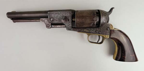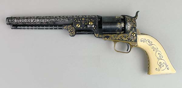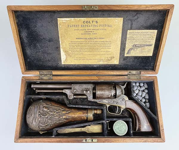Kleinfelters Auction in Myerstown, Pa., is holding an online Spring Antique Extravaganza sale, which begins closing Saturday, April 19, at 1 p.m. Among the expected stars of this sale are two rare antique Colt revolvers. They are lot #2141 and #2142. The former is a Model 1851 Navy presentation gun marked Major Fred K Hardy 84th Reg on the grip frame. Its fully engraved and inlaid with 18-karat yellow gold and what appears to be platinum (metals have not been tested). The serial #25088 was manufactured in 1853. With a small crack at the upper left-hand grip, it exhibits a small amount of blue wear on the front of the cylinder. With matching serial numbers and what appears to be near perfect screws, the wedgepin has slight marks from assembly and disassembly. The left barrel lug has a sultan holding a sword and a pistol, and the right barrel lug has a cheetah. The trigger guard and grip frame appear to be 18-karat gold plated with floral embellishment. Grips have a scroll pattern carved on both sides. Engraved in the style of Gustave Young, the gun is contained in a factory-like case with an unmarked bullet mold, powder flask and original cap tin. The second revolver is a 3rd Model Dragoon Presentation gun marked Col Hugh Forbes Fidei Defensor on the grip frame. Also manufactured in 1853, the frame, barrel lug and hammer are fully engraved with scroll patter. The muzzle is lightly embellished at the end. Its serial #13630 and has matching numbers. This gun has normal light wear for its age with two-piece excellent grips. The top of barrel lug is engraved Sam Colt surrounded by scroll. The gun is contained in a factory-like case with instructions inside the lid with Colt marked bullet mold containing round and conical internals. It also contains Colt patent powder flask and Colt marked cap tin. The auction house has garnered a lot of excitement with these revolvers. They are highly collectible antique firearms. Antiques & Auction News will have a post-sale follow up in a future issue. To learn more, call Kleinfelters at 717-272-7078 or visit www.kleinfelters.com for a link to the online catalog.